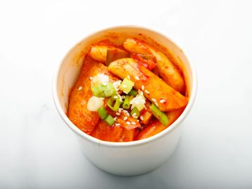 Skewered and fried rice cake, brushed with sweet, spicy, and tangy gochujang sauce