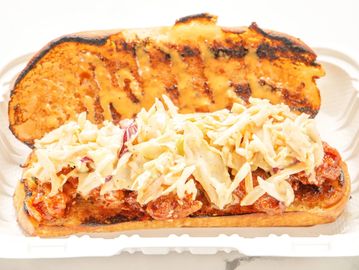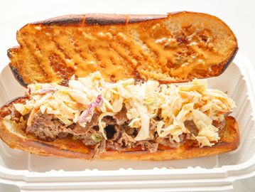 A Korean-American fusion sandwich made with a butter-toasted hoagie sub roll, shaved rib eye marinated in a light bulgogi sauce, a drizzle of savory kimchi butter, sautéed onions, jalapeños, bell pepper, white american cheese, provolone cheese, thinly sliced scallions, and finished with our house gohujang mayo sauce. (ONLY AVAILABLE UNTIL 10/26)